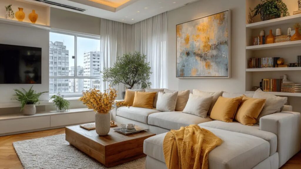 Pense em sofás arredondados, mesas de centro circulares e prateleiras em formato de arco. Essas peças tornam os ambientes mais dinâmicos e confortáveis — ideais para relaxamento e conversa.